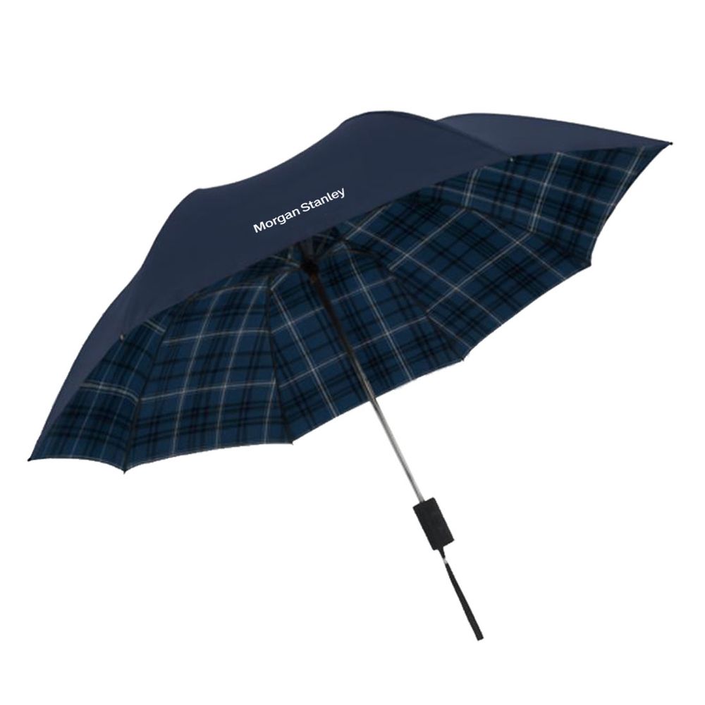 sku: MSEU2458Double cover, full-color folding umbrella. Morgan Stanley exclusive tartan pattern on underneath layer. Morgan Stanley white logo on navy top layer. Auto open/auto close. 42" arc.